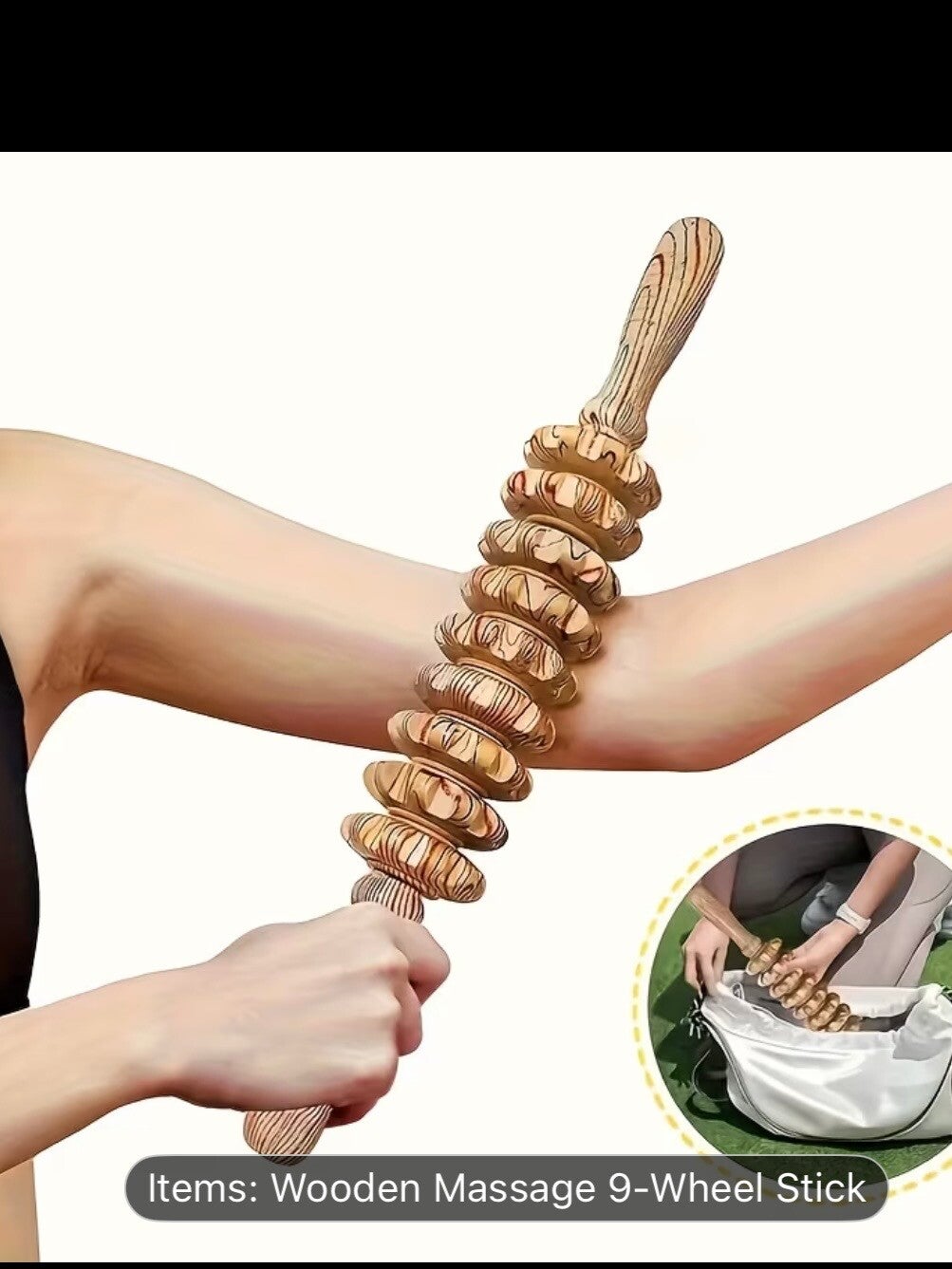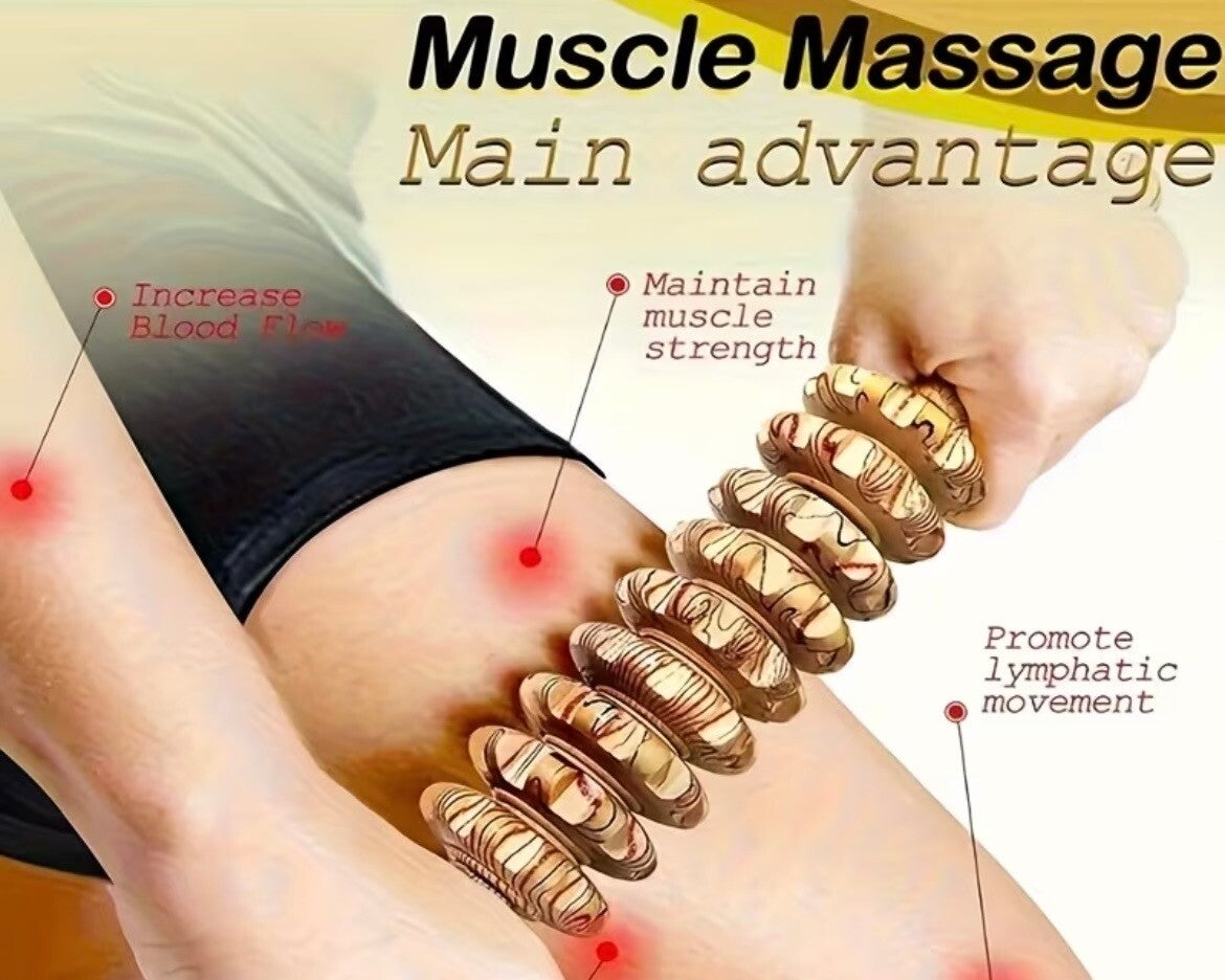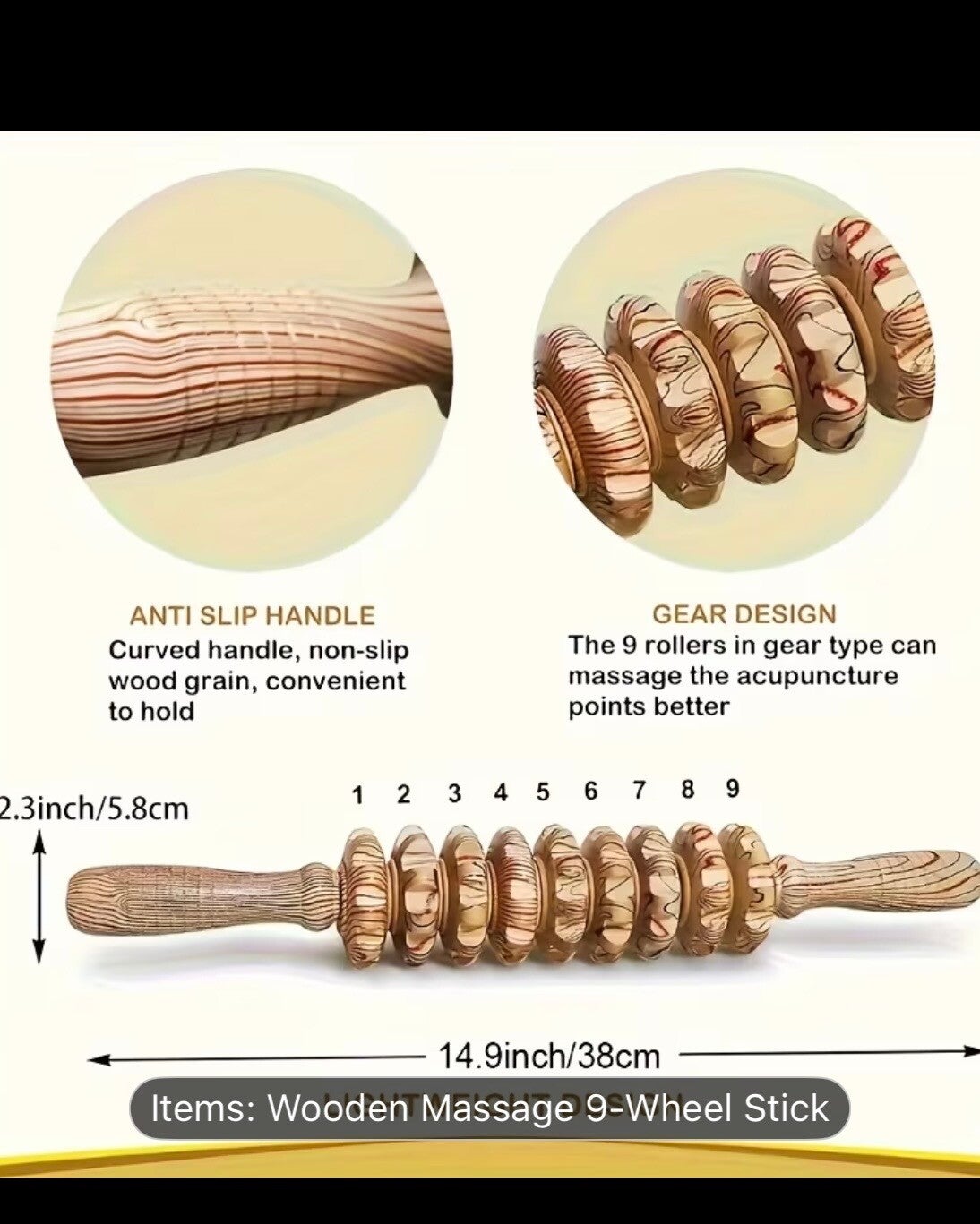 Experience deep relaxation and body shaping with this ergonomic massage tool. Designed with nine smooth wooden rollers, it helps stimulate circulation, relieve muscle tension, and support natural body contouring.